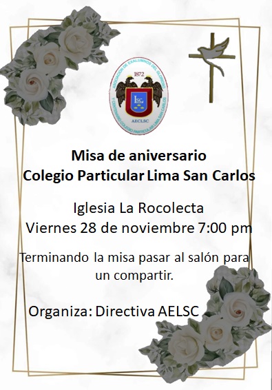 Se invita a todos los ex alumnos, auxiliares y profesores del Colegio Particular Lima San Carlos a la misa de aniversario del Colegio. Terminada la misa se realizará un compartir en el salón de la Iglesia. Hora de la misa: 7 pm